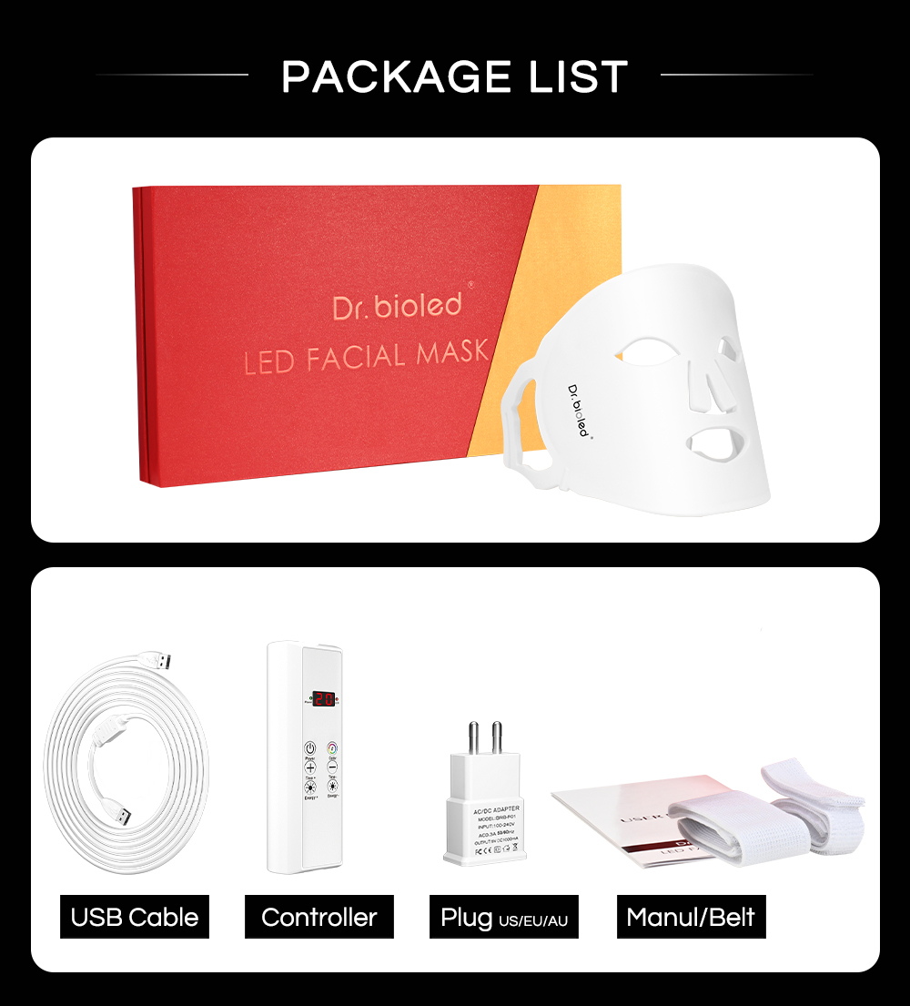 Package List | 1 * LED Mask 1 * Power Cord 1 * Manual 1 * Adapter 1 * USB Cable 2 * Belts |